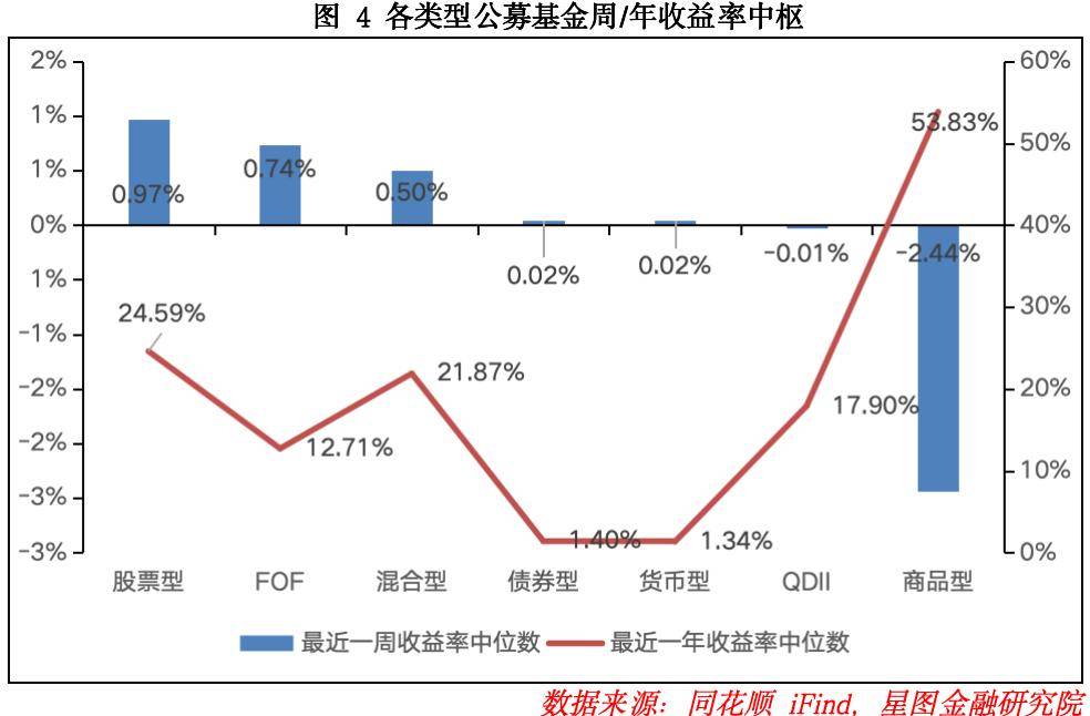 本周公募基金收益呈现分化趋势。受益于全A 平均股价上行,股票型基金与混合型基金收益率中枢分别为 0.97% 与 0.50%,均取得正收益,但较上周分别下行 1.55pct与1.70pct,主要因市场反弹动能较上周有所减弱;受海外市场小幅回调影响,QDII 基金收益率中枢为-0.01%,较上周下行 1.45pct;受黄金等贵金属突破新高后回调影响,商品型基金收益率中枢为-2.44%,较上周大幅下行 5.13pct;受债券市场回调影响,债券型基金收益率中枢较上周下行0.07pct。从年度收益率维度来看,股票型与QDII 型基金收益率中枢有所上行,其余类型基金年度收益率中枢均呈下行趋势。