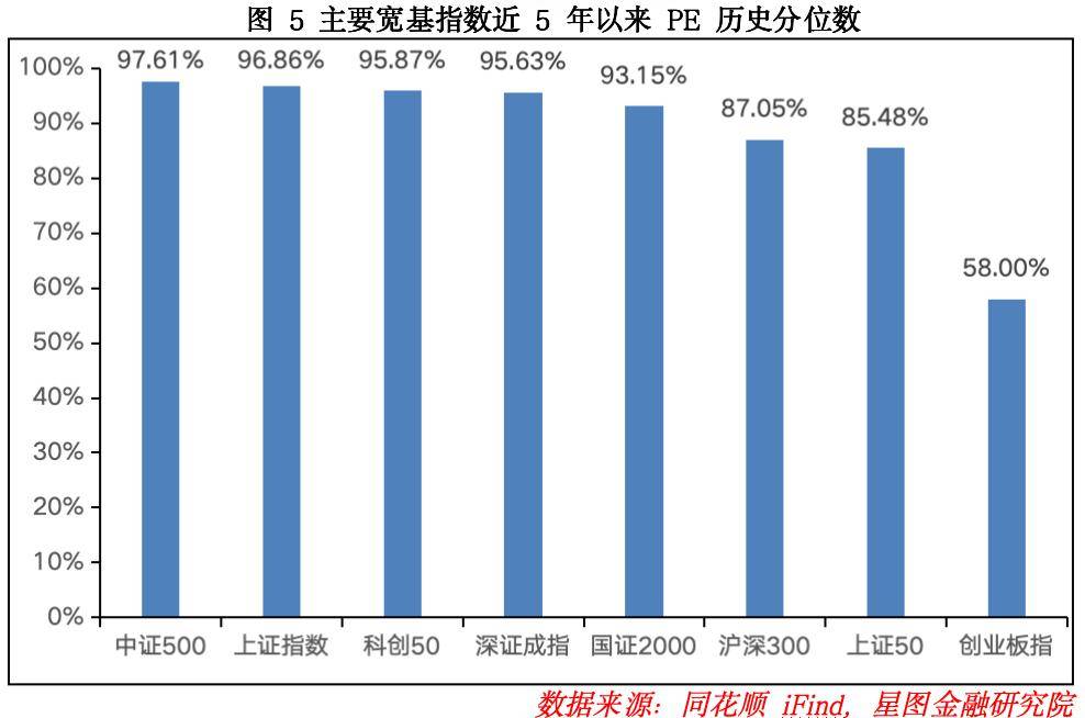 从近5 年估值分位来看,各主要指数估值出现分化,上证指数、科创50、深证成指、上证 50 的估值分位数有所上行,其余指数估值分位则呈下行趋势,市场整体估值处于绝对高位水平。具体来看,中证 500、上证指数、科创 50、深证成指、国证 2000 的估值分位均处于 90% 以上的历史高位;上证 50、沪深 300 处于 80% 以上历史分位;仅创业板指估值分位相对较低,为 58.00% 历史分位。整体而言,当前市场估值呈现结构性差异,成长风格板块估值高于价值风格板块,小盘股估值高于大盘股,沪市估值高于深市。后续市场上涨空间或将取决于政策催化力度与基本面修复进度。