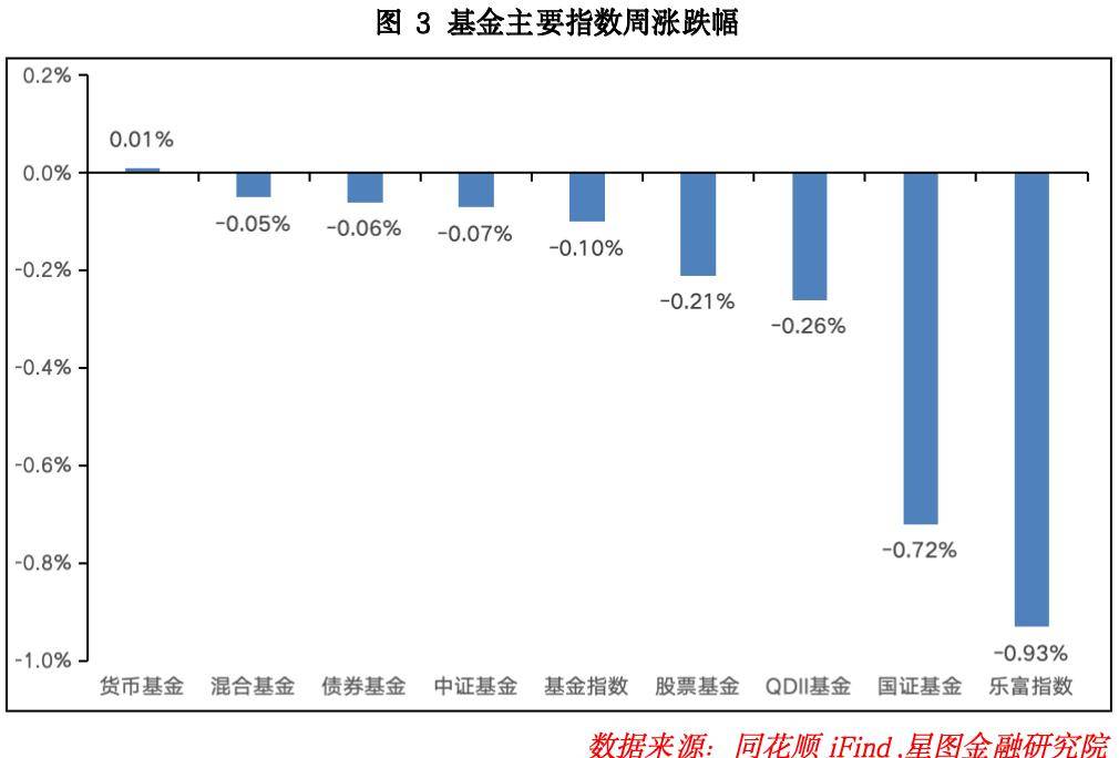 本周基金市场整体表现不佳,除货币基金外,其余类型基金均录得负收益。本周权益市场小幅波动,全A 平均股价虽有所上行,但主要指数大多下移,导致混合基金与股票基金出现小幅回调,分别下跌0.05% 与 0.21%;受海外市场回调影响,QDII 型基金本周下跌 0.26%;债券型基金同步回调,小幅下行 0.06%,表现不及上周。从市场分布来看,沪市表现强于深市,基金指数等沪系基金指数跌幅小于乐富指数等深市相关基金指数。